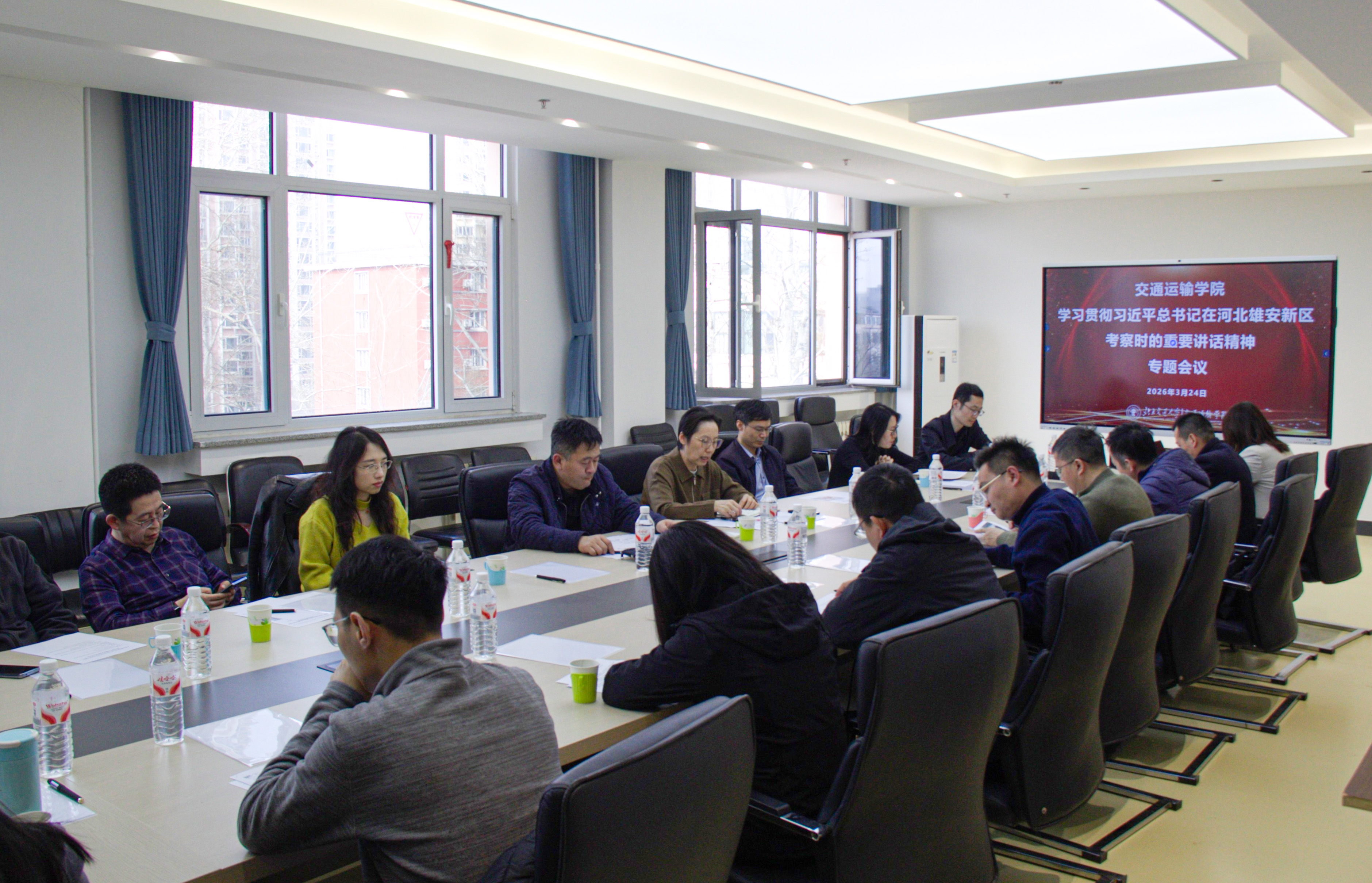 3月24日下午,交通运输学院召开专题会议,学习贯彻习近平总书记在河北雄安新区考察时的重要讲话精神,学院领导班子成员、全体系所主任和教工党支部书记、教授和青年教师代表参加了会议,会议由学院党委书记孙冬梅主持。