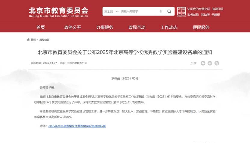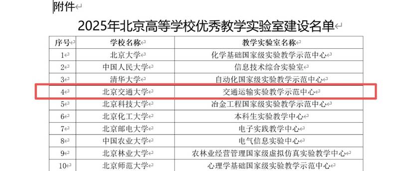 近日,北京市教育委员会公布2025年北京高等学校优秀教学实验室建设名单,交通运输学院交通运输实验教学示范中心成功入选。